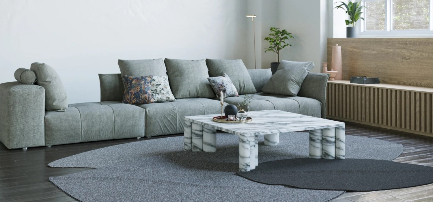 Espace blanc approprié : Par exemple, un tapis à côté de la table basse permet de créer une sensation d'espace et de respiration. |