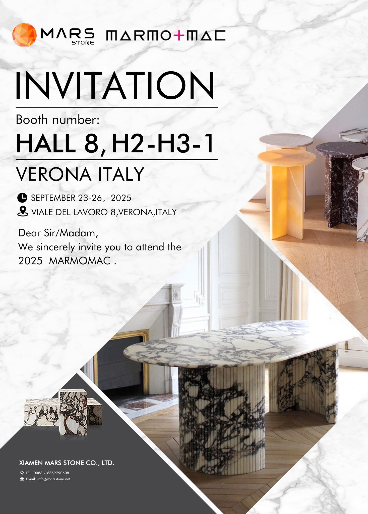 L'exposition devrait se tenir au parc des expositions de Vérone en Italie du Du 23 au 26 septembre 2025Notre stand est H2-H3-1 dans le Hall 8Nous présenterons des meubles en marbre et des objets artisanaux en marbre, offrant ainsi un canal de communication professionnel aux acheteurs et aux partenaires.