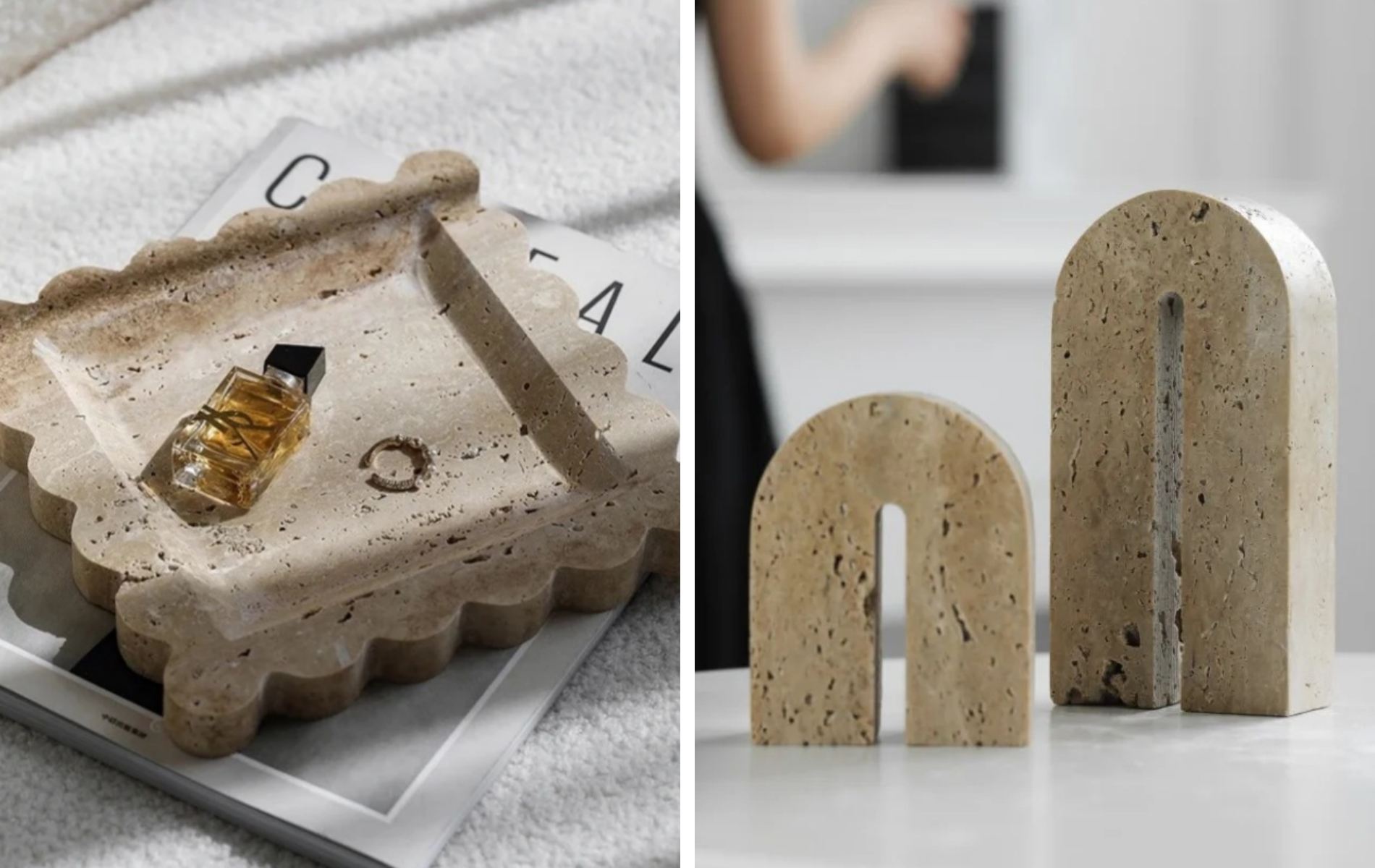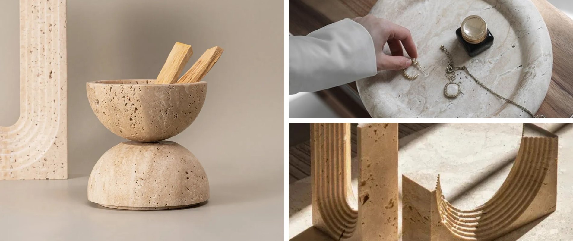 Les objets en travertin, avec leur texture poreuse unique et leurs tons chauds et terreux, sont très appréciés des amateurs de design. Formés par des eaux de source riches en minéraux au fil des millénaires, chaque objet porte les traces du temps, transformant des objets fonctionnels en « histoires de la terre ».