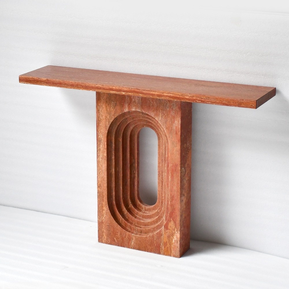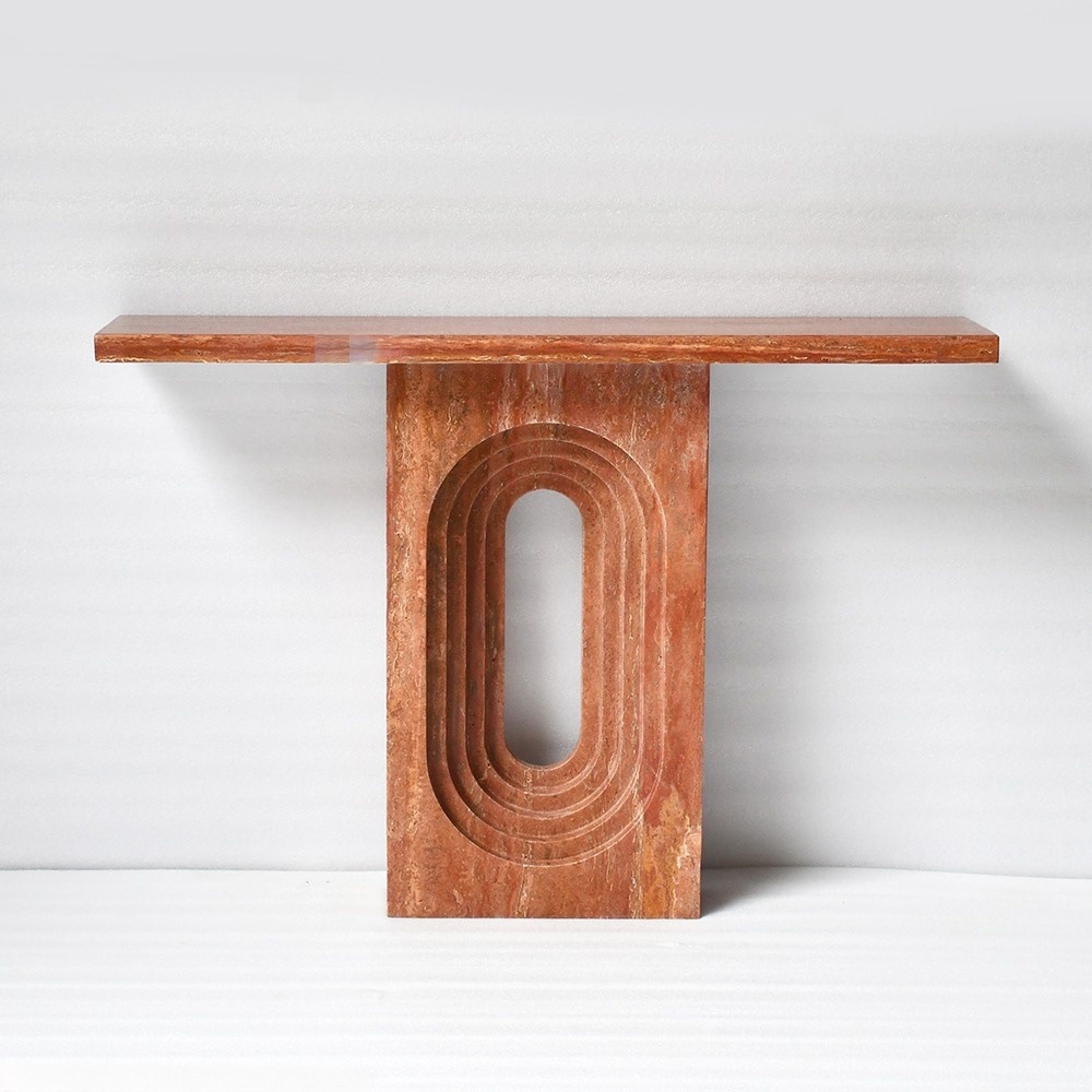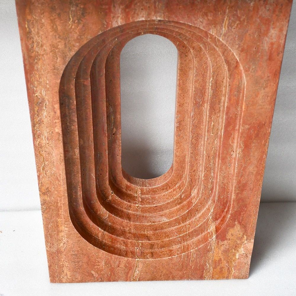 La caractéristique marquante de cette table réside dans sa découpe ovale concentrique saisissante : une série de cavités ovales imbriquées et superposées, sculptées dans un socle monobloc en travertin. Ce design tridimensionnel et rythmé crée un point focal visuel dynamique, jouant avec la lumière et l’ombre pour adoucir la robustesse de la pierre tout en lui conférant une profondeur architecturale. Sa silhouette épurée en forme de T allie audace et minimalisme, en faisant une pièce maîtresse polyvalente pour tout espace.