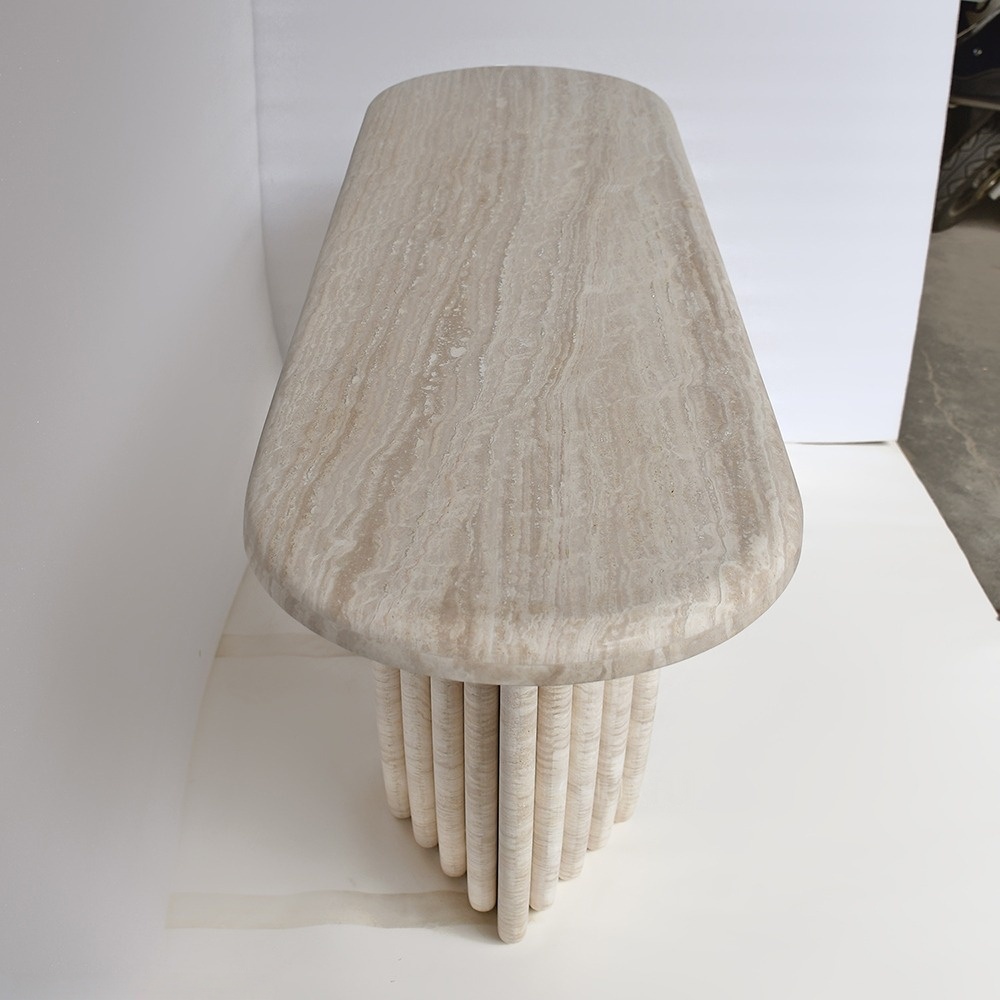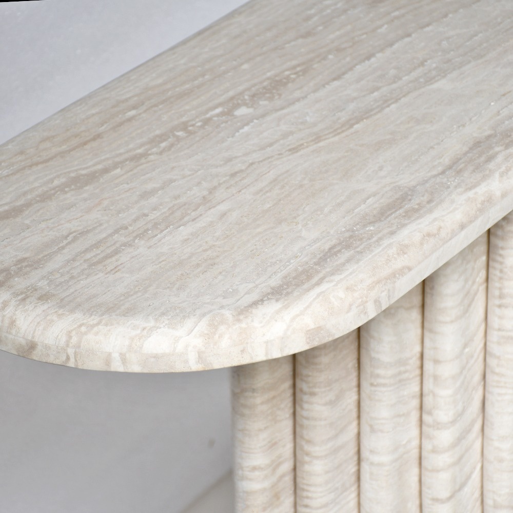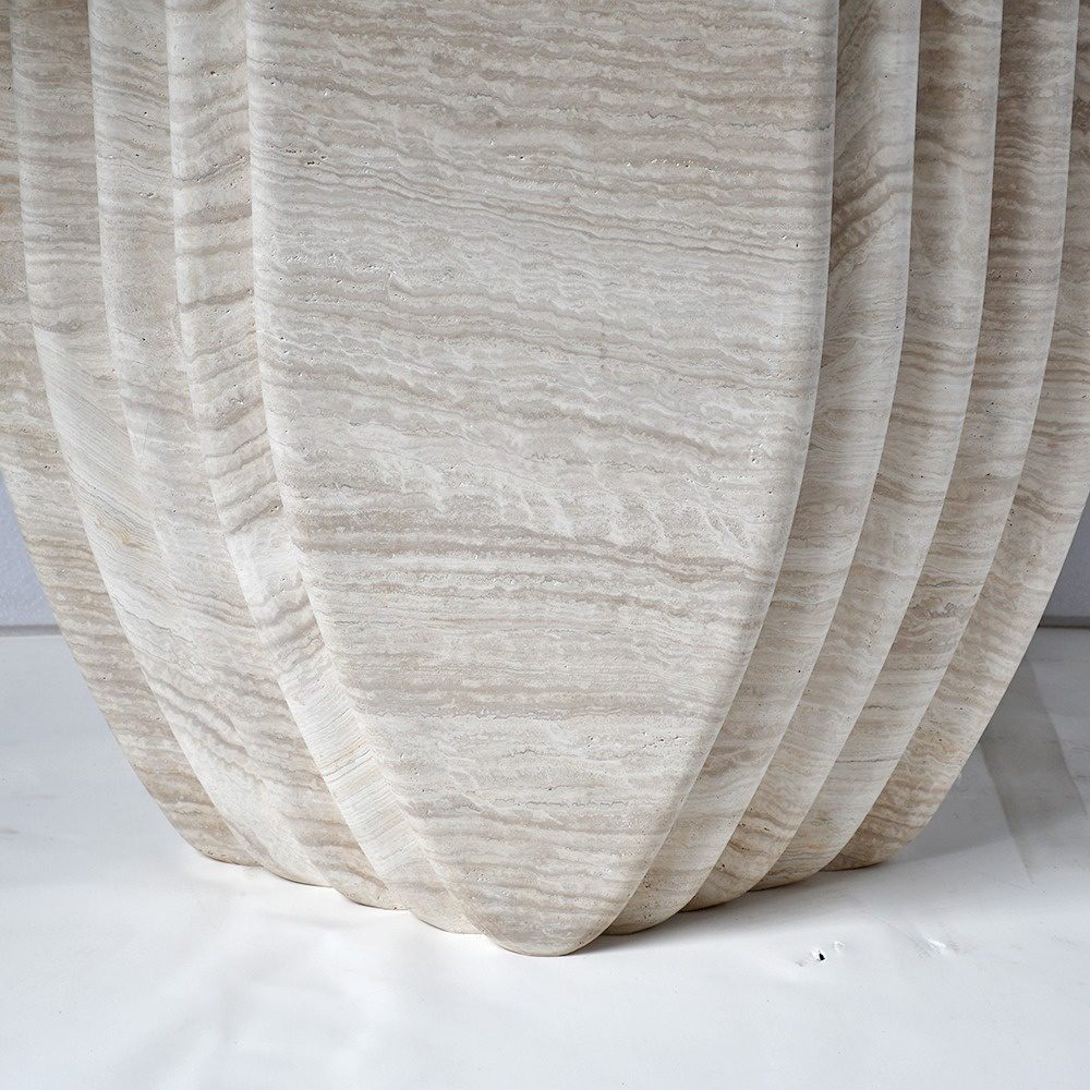 The table’s defining feature is its shell-inspired fluted base: evenly spaced vertical grooves curve gently outward, creating a soft, fan-like silhouette that evokes natural shell forms. The fluted design catches light beautifully, adding depth and dimension to the stone’s warm tones while balancing the table’s solid structure with a light, airy aesthetic.
