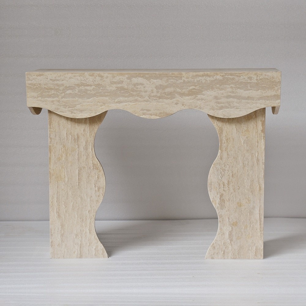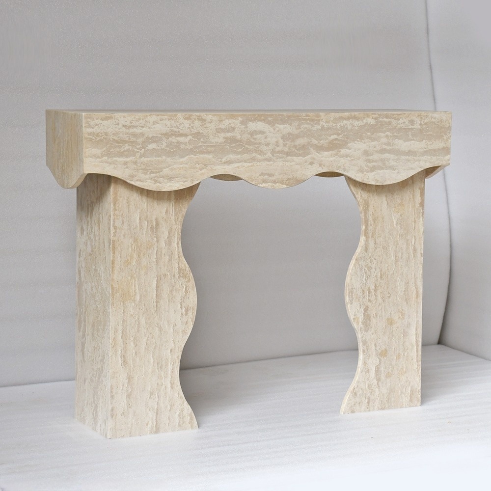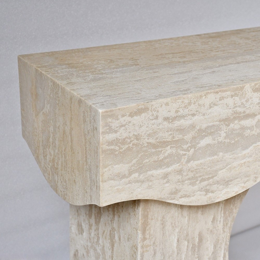 La caractéristique principale de cette table est sa silhouette festonnée continue : un bord ondulé et fluide court le long du dessous du plateau, se fondant harmonieusement dans deux pieds incurvés et ondulés assortis. Ce design doux et rythmé adoucit la solidité de la pierre, créant une silhouette légère et aérienne, à la fois intemporelle et moderne.